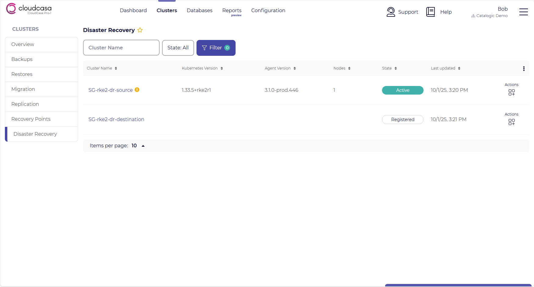 The Disaster Recovery page provides information about all of the Kubernetes clusters that have been configured to use CloudCasa DR for Storage. It also allows you to define backup and restore jobs for these clusters.