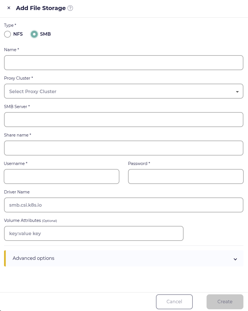 In the Storage page, select the File storage tab, click Add storage +, and select SMB type. You can then specify the following fields: