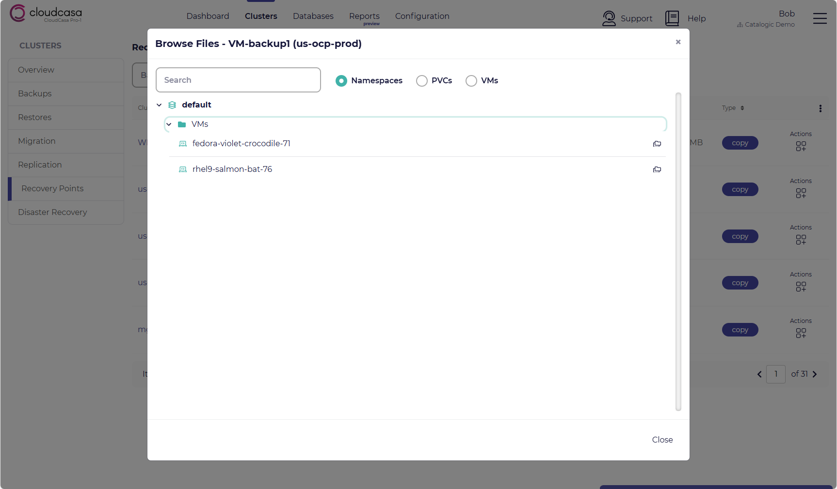 You can browse and retrieve files from the PVCs in a recovery point, and even from within VMs in a recovery point, using the file browser. To do this, select Files from recovery point actions for any “Copy” type recovery point in the list. This will open the Recovery Point File Browser.
